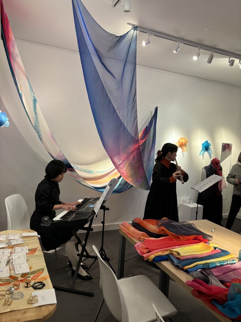 「シルク作家の展示会では会場中に美しいシルクのスカーフが飾られました」