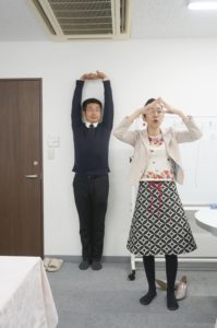 頭が動かないように、片足立ちの練習をします。